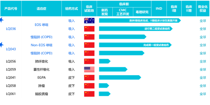 LQ043为全球首款广谱哮喘/COPD吸入式TSLP纳米抗体治疗药物,与LQ036一样,吸入给药起效更快,并可以减少用量,增加安全性。LQ043采用毕赤酵母系统生产,产量高达20g/L,生产成本远低于动物细胞表达的抗体药物,有望具备小分子药物的价格优势并实现抗体药物的疗效及安全性。