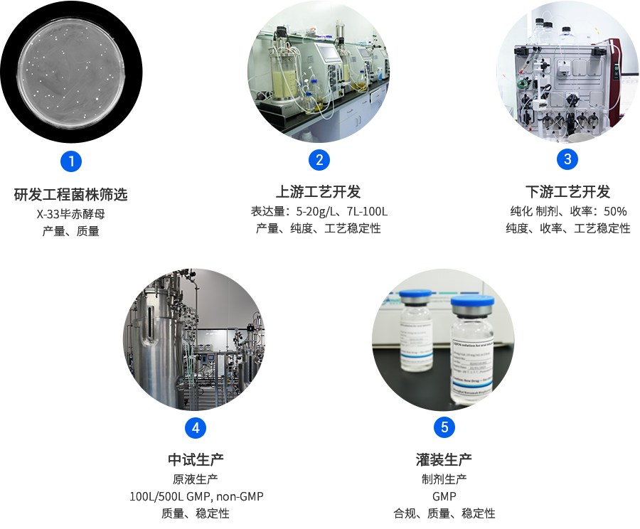 九州ku游官网生物已成功建立毕赤酵母CMC平台,现在已具备多个完整项目开发经验。毕赤酵母CMC平台90%以上的项目产量在1g/L以上,纯化平台工艺,其整体回收率在50%以上。从细胞株构建到蛋白纯化仅需3-4个月,极大地缩短了项目开发时间。